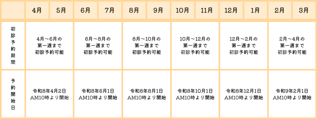 ※初診予約可能日については、偶数月の1日更新で、その月から2カ月後の第一週までとなります。以下の表をご参照ください。
